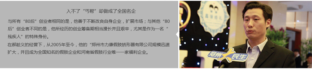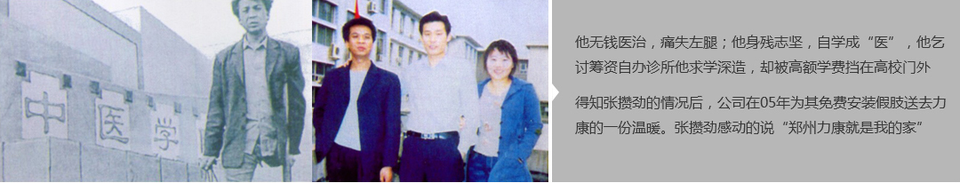 鄭州市力康假肢矯形器有限公司(簡稱力康),是一家專業從事假肢矯形器的設計、研發、制作及裝 配的專業機構。成立于1992年是河南省唯一一家福利企業。力康下設業務部、技術部、住院部、康復 部、售后服務部,并配有現代化的裝配車間和功能齊全的訓練大廳,為殘疾朋友康復訓練提供了可靠 保障??偨浝泶┐骷僦嗄辏兄S富的臨床經驗和親身體會;多年來,力康已為全國幾十萬名殘疾 朋友安裝上舒適、美觀、耐用的假肢和矯形器具,使他們更大限度地恢復了正常的工作和生活?!爱a 品即人品”的質量理念、先進的技術、實惠的價格、完善的售后服務是力康取勝的法寶……